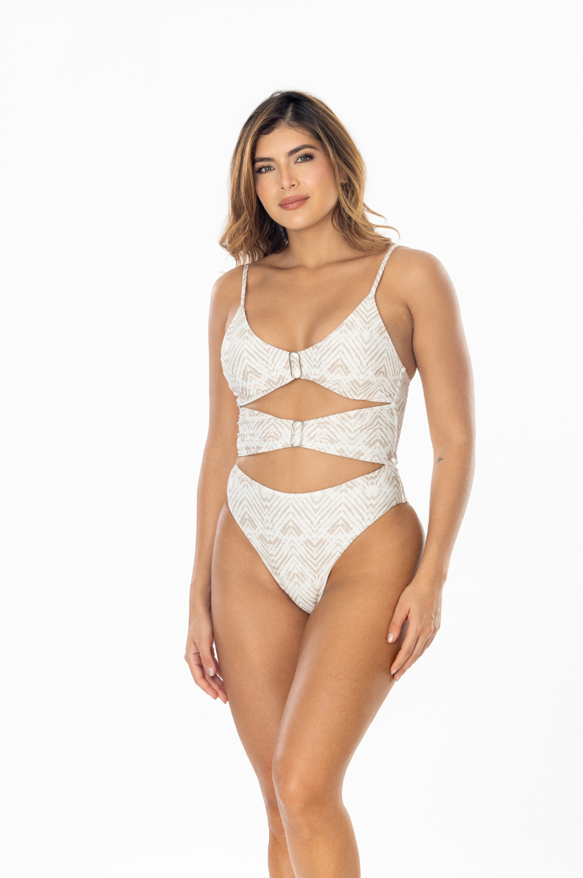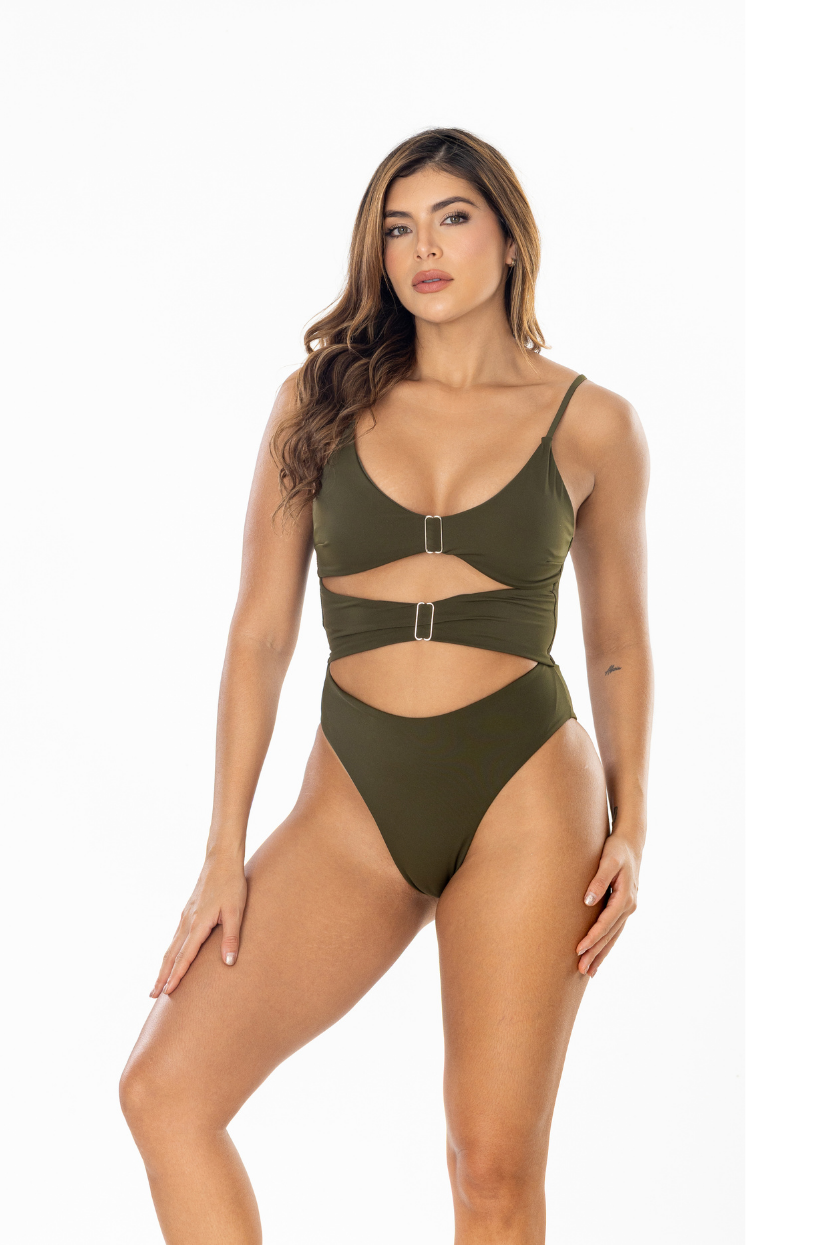 One-piece with a cut-out design, featuring decorative buckle details, adjustable straps for a customized fit, and a full-coverage bottom.